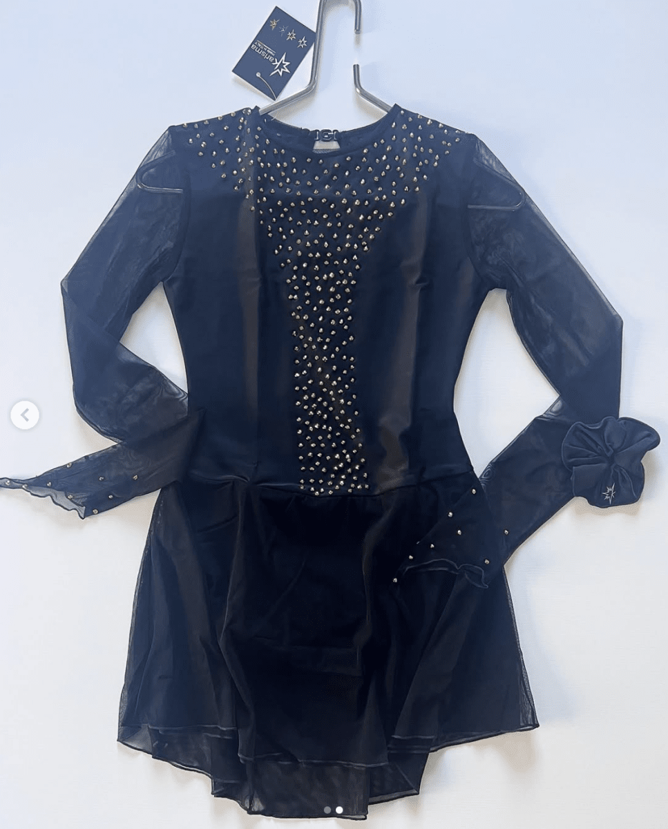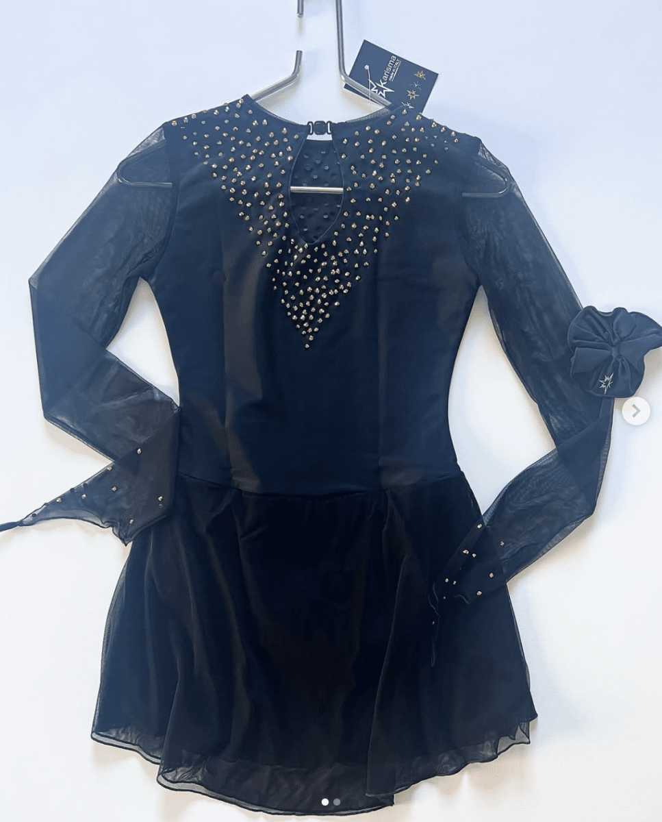 Svart tävlingsklänning med guldstrass. Ta din konståkning till nästa nivå med denna exklusiva tävlingsklänning i djup svart nyans, dekorerad med gnistrande guldstrass som fångar ljuset i varje piruett. Klänningen är designad för att kombinera stil, komfort och rörelsefrihet så att du kan fokusera fullt ut på din prestation. Den här klänningen är inte bara ett plagg, den är en upplevelse. Med sin sofistikerade färg och skimrande detaljer blir du garanterat ett blickfång på isen. Beställ idag och gör varje rörelse till ett ögonblick av magi.